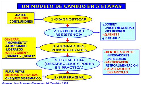 Existen diferentes modelos o estrategias que proponen los especialistas para la conducción de cambios en las organizaciones. Uno que resulta bastante simple en su presentación, pero que puede contribuir a identificar aspectos importantes que deben tenerse en cuenta es el que propone Stewart que consta de las cinco etapas siguientes